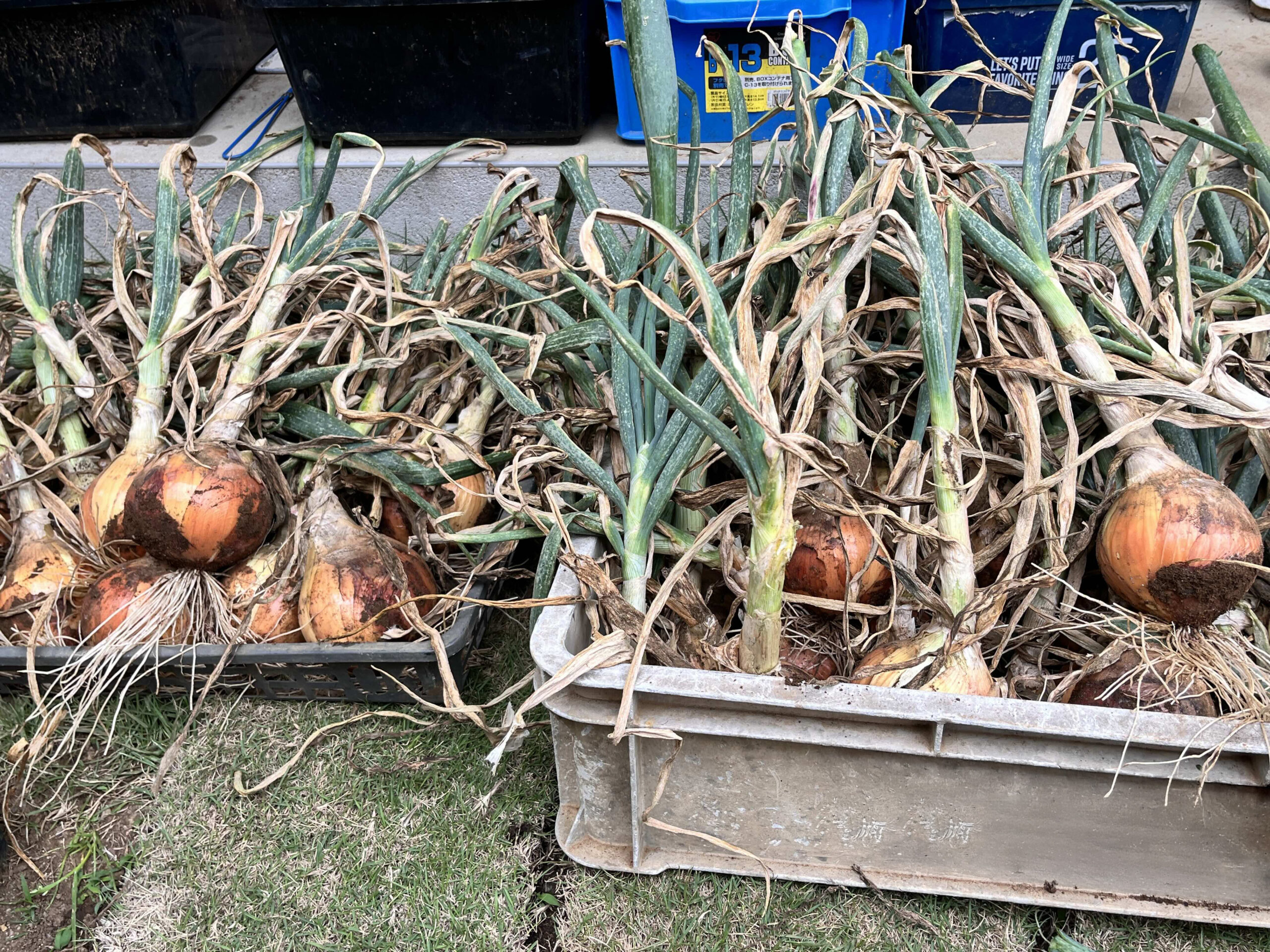 そして、収穫した玉ねぎは、葉をカットし、駐車場の屋根から吊るして保管。
