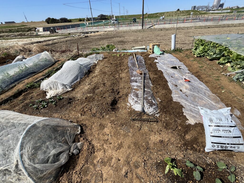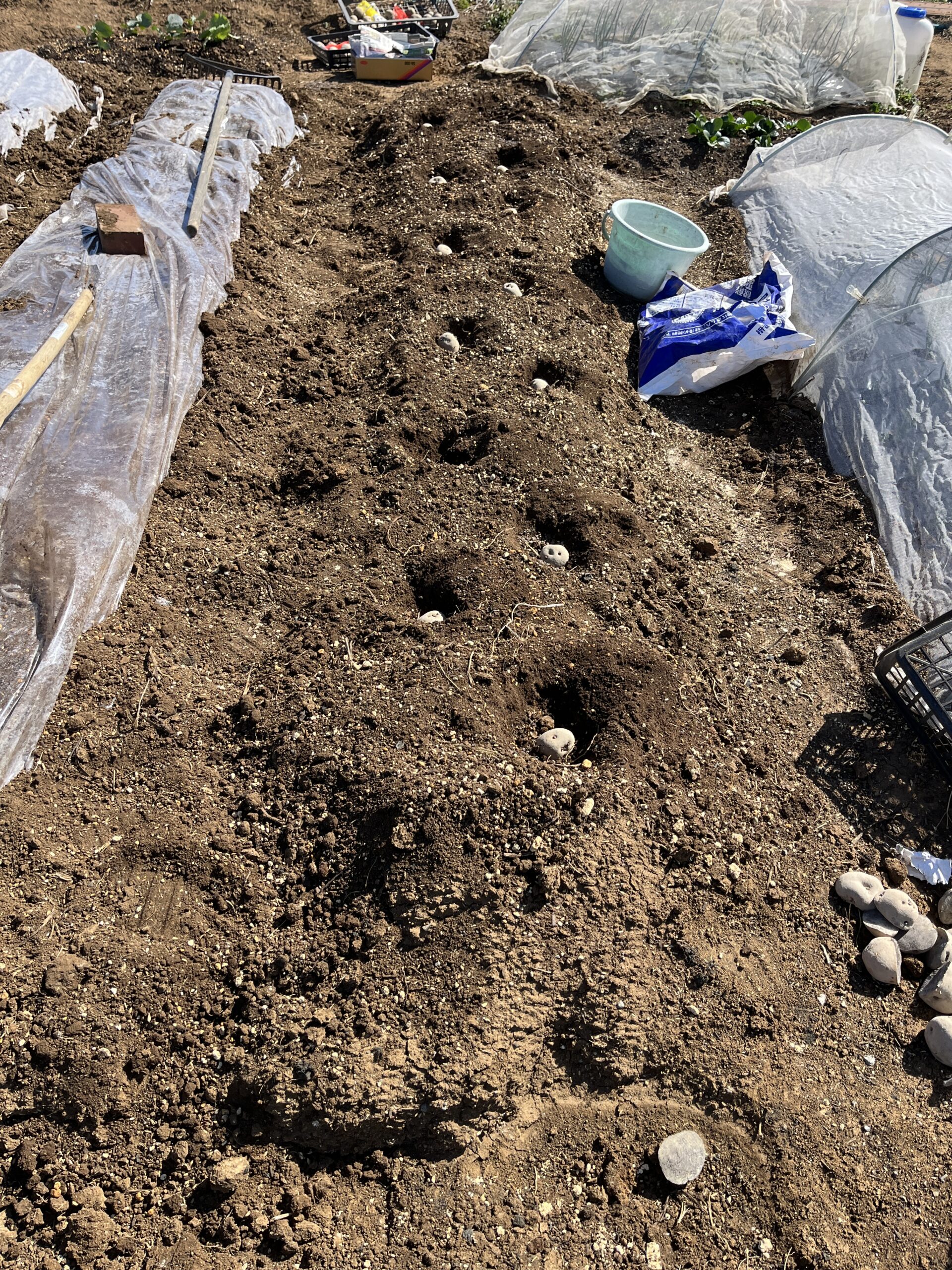 まだ、少し朝晩が寒いので、このあと少し深めに植え付け、肥料を入れて、念の為ビニールをかけて保護します。