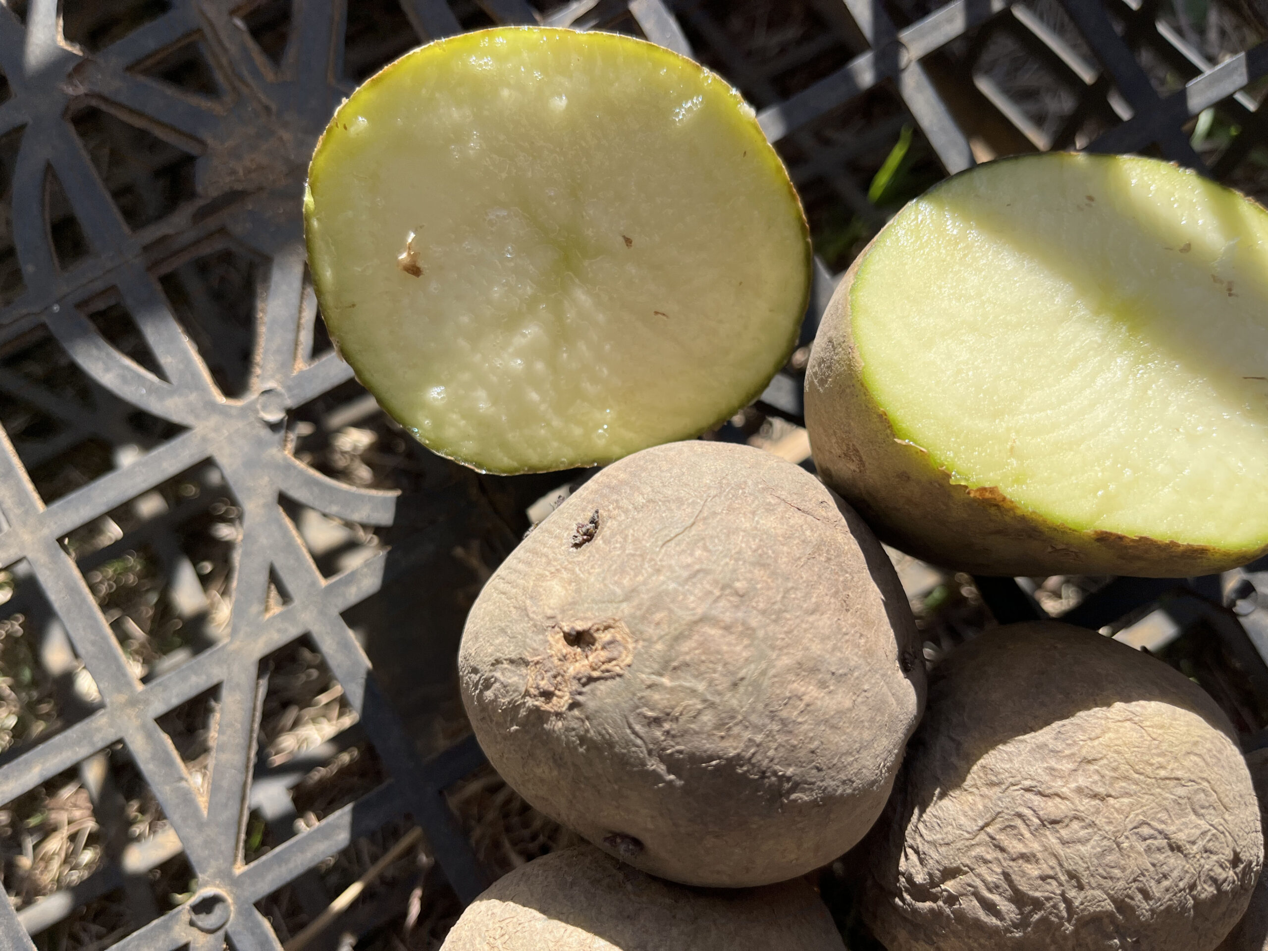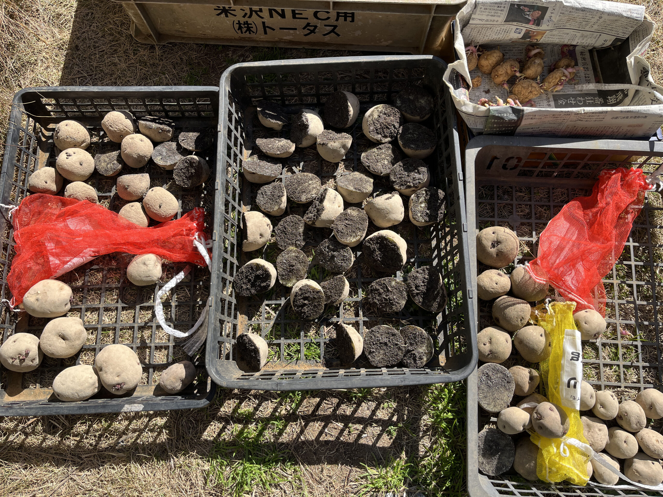基本小さい種芋はそのまま植え付けて、大きいものは芽を傷つけないように半分にカットし、さらにカットした部分が腐食しないように炭を塗り保護した上でいざ畑へ。