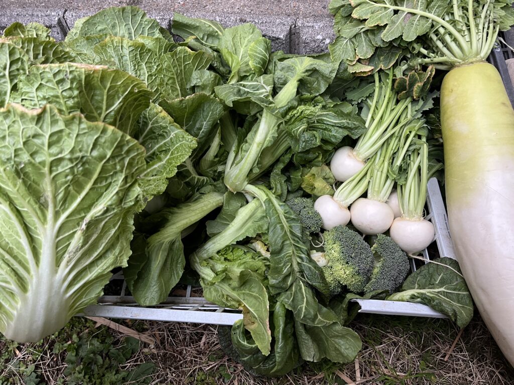 白菜に高菜、ブロッコリーと大根とカブ(一部畑の先輩からのおすすわけなども含む)を自宅の庭できれいに洗って一部は冷蔵庫へ。